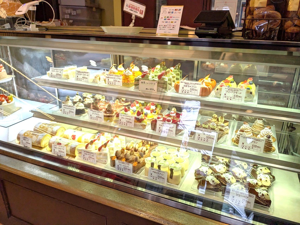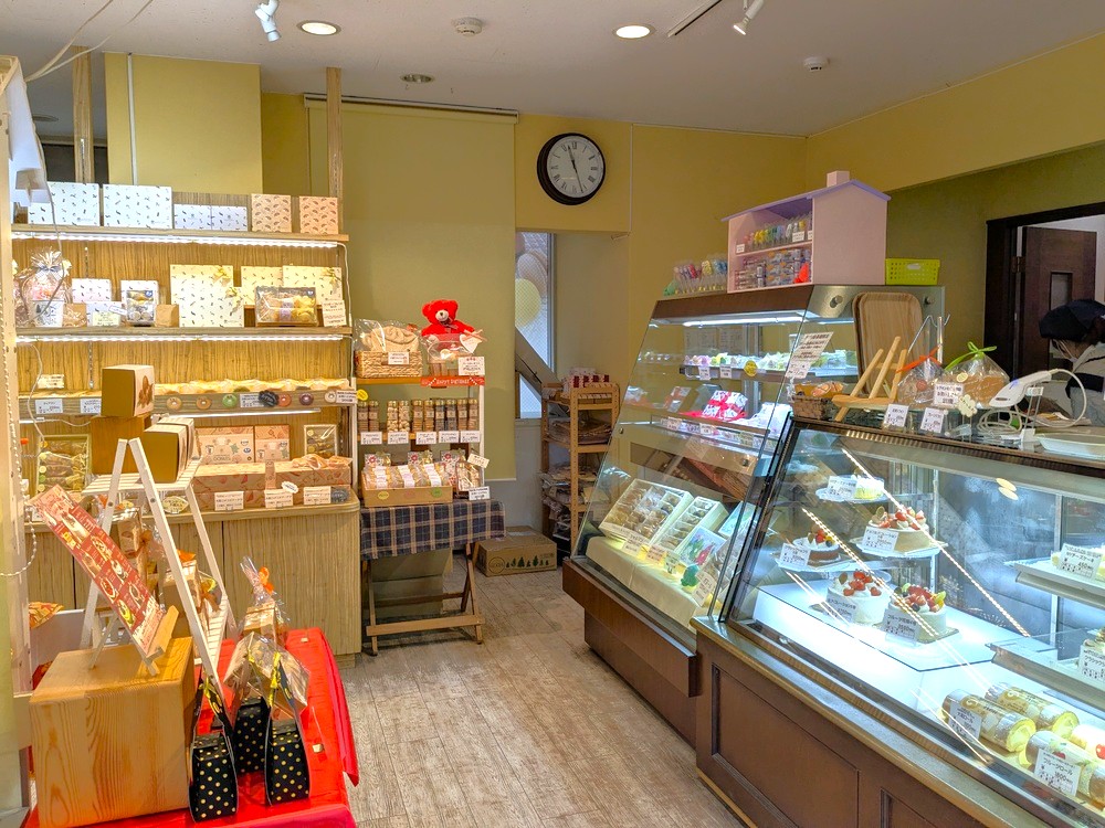 ショーケースには季節限定ケーキや定番のショートケーキ、チーズケーキ、フルーツタルトなども並び、どれも地元産の素材を活かした優しい甘さが魅力です。