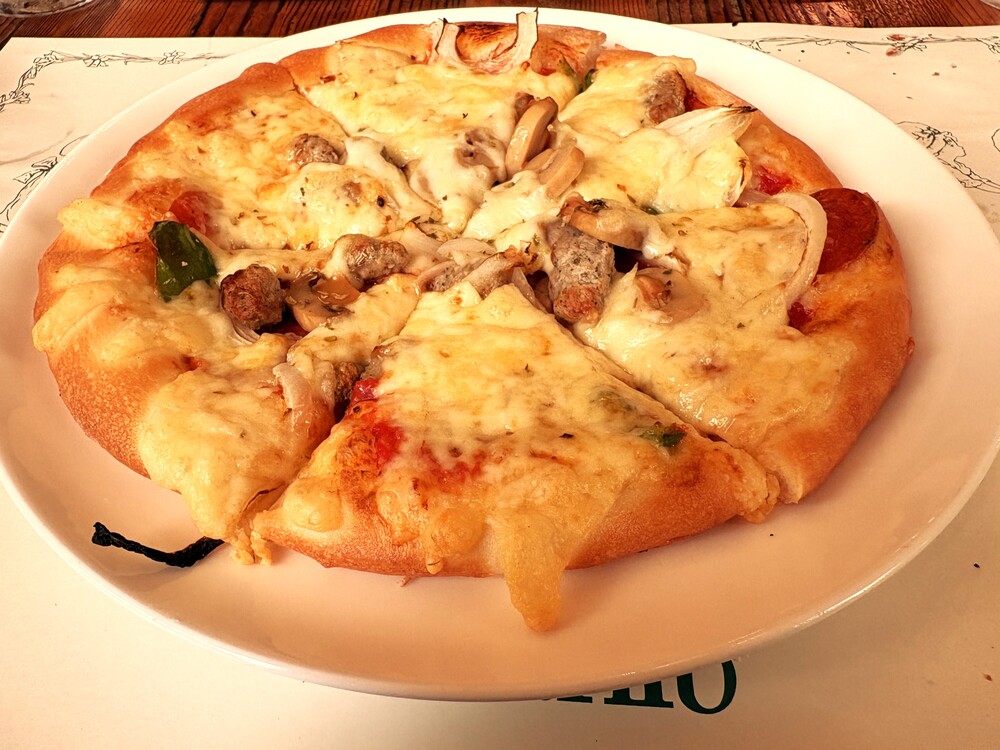 ペパロニとソーセージ、そしてたっぷりの野菜がのった具だくさんのピザで、食べ応え抜群でした!