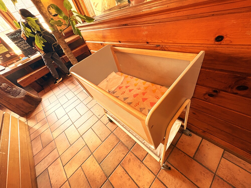また、座席には子どもいすはもちろんのこと、まだお座りができない小さな赤ちゃんのためにベビーベッドまで用意されています。