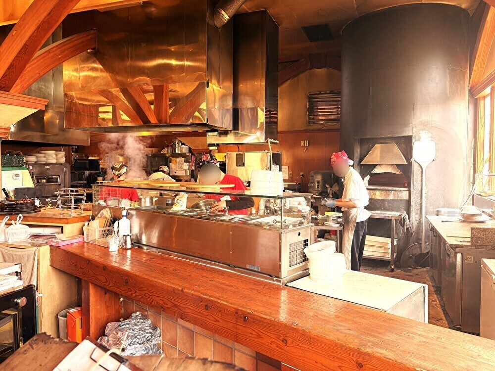 厨房はあえてお客さんから見えるように配置されており、その右奥に大きな石窯が!