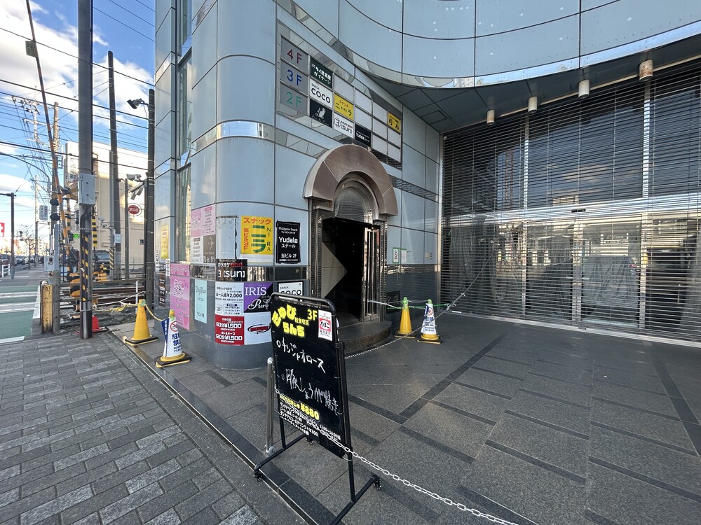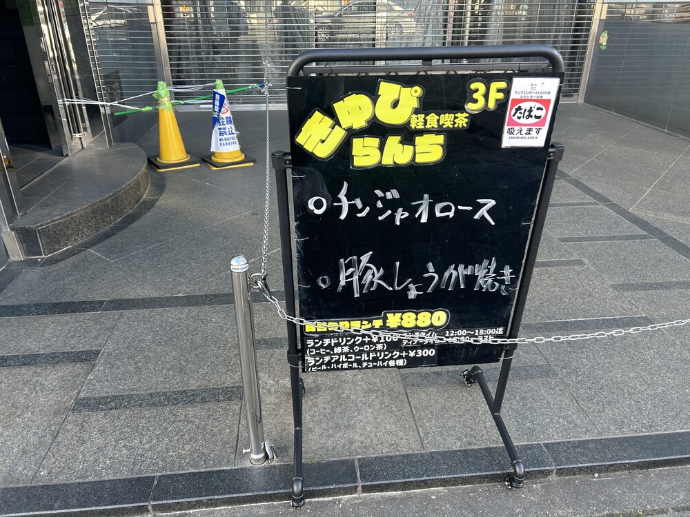 この日は天気が良く、外食しようと鶴間駅で電車を降りて西口を出たとき、目の前のビルに看板がぽつりと置いてあるのを見つけました。