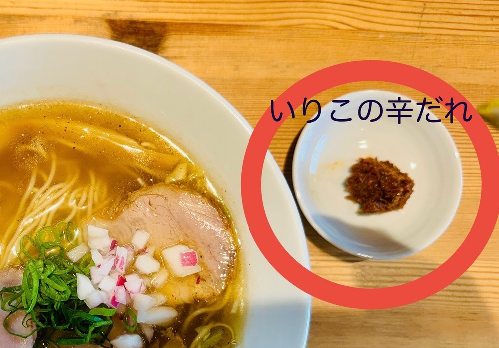 塩ラーメンには邪道かもしれませんが、辛いもの好きの私にとって外せない「いりこの辛だれ」もおすすめ。半分くらい食したのちに、少しずつスープに溶かしていくと、また風味が変わっておもしろいんです。