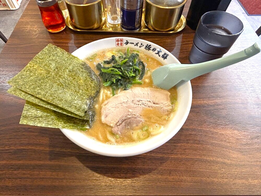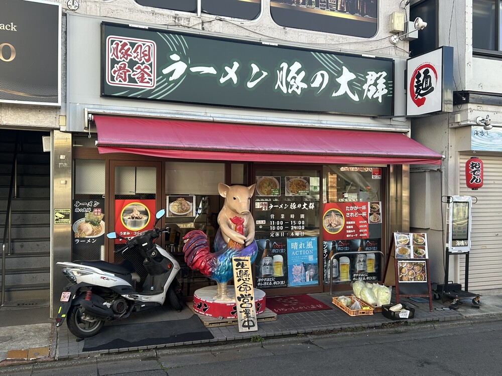 鶴間駅西口の階段を降りてすぐ、店名通り、豚の味付けにこだわったお店、「ラーメン豚の大群」をご紹介します。