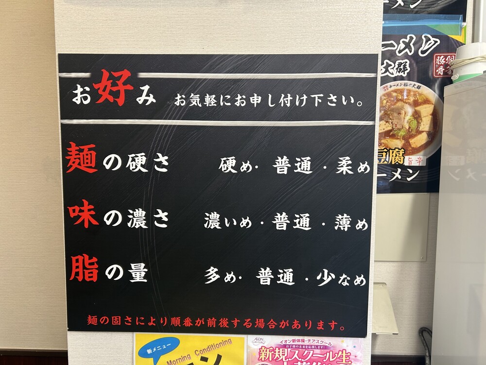 ラーメンの麺の硬さ、味の濃さ、脂の量を三種類から選べるそうです。