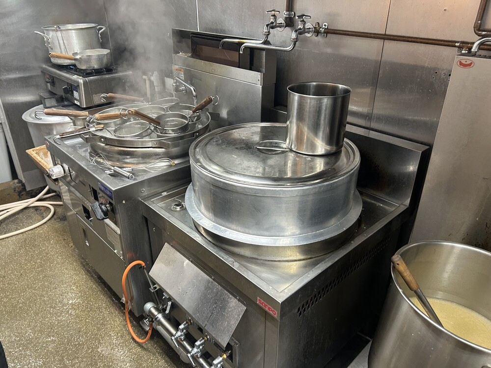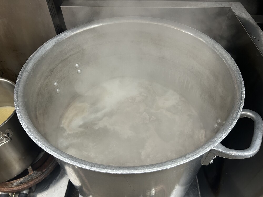 今日と明日の分を作っている途中とのことで、ぐつぐつ煮えたぎる鍋の中で豚骨が熟成されていました。