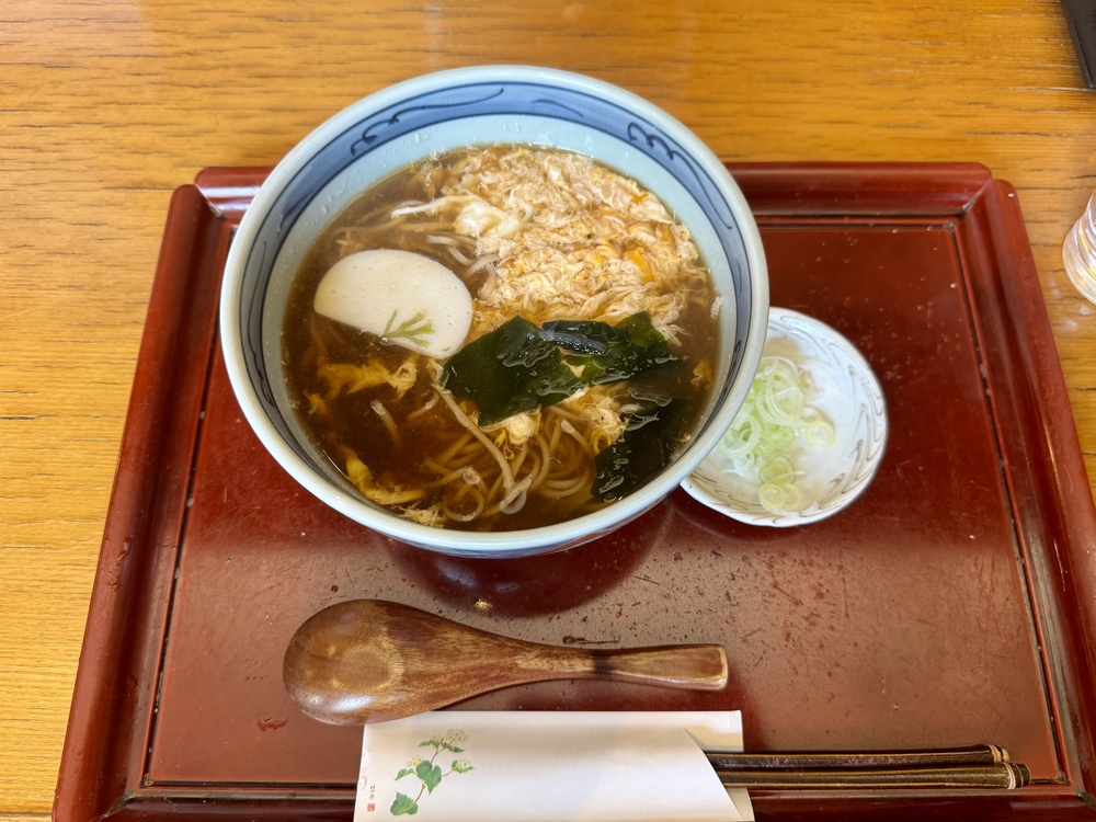 運ばれてきたのは、素朴な見た目のかけ蕎麦に、ふんわりとしたかき玉とかまぼこが添えられているお蕎麦です。