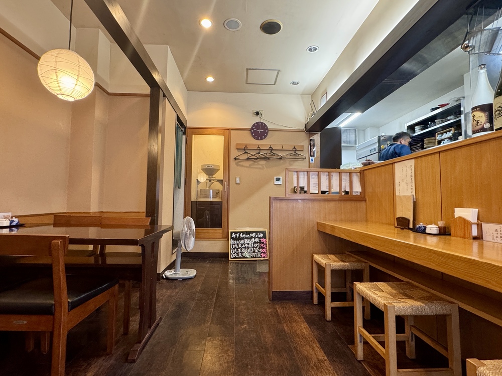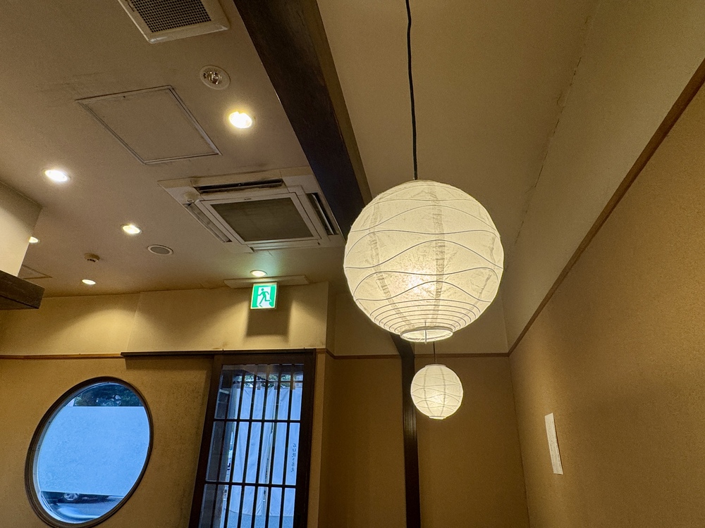 扉を開けると、白いちょうちん型の照明と暖色系のダウンライトが店内を照らしています。4人がけのテーブル席2つとカウンター7席。