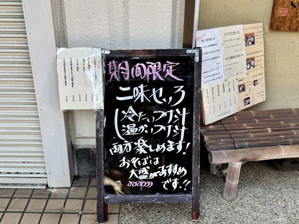 お得に2つのつゆが楽しめるのは、二味せいろ。数種類あるつゆの中から好きなつけ汁を2つ選べるんです。こちらもオススメ!