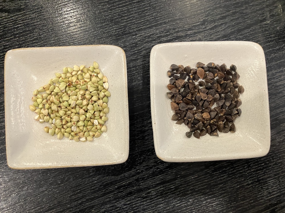 左側の淡い緑色の実が殻をむいたもの。毎日この実を石臼で挽き、粉にしているそうです。右側の黒いのは蕎麦の殻。