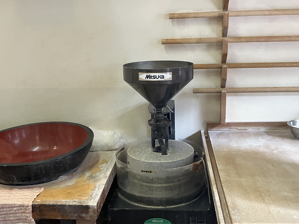 手打ち蕎麦と店名につくように、店内には蕎麦打ちの部屋があります。正面に見えるのが石臼。