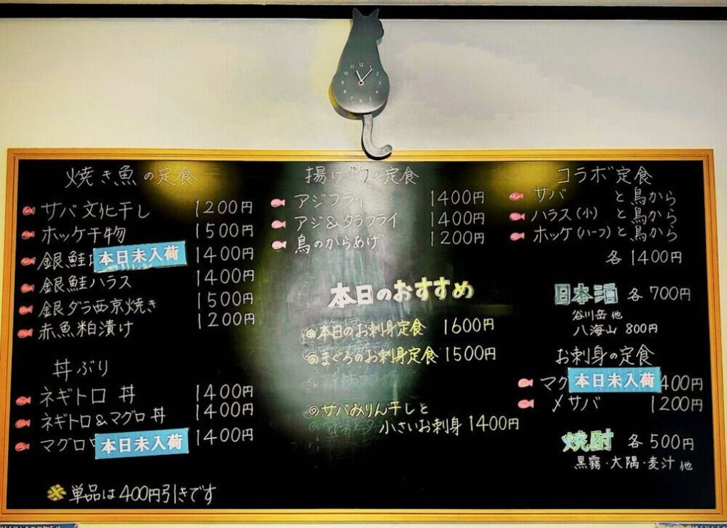店内に掲げられたメニュー表には、その日の入荷状況によって内容が変わるおすすめ定食が紹介されています。アジフライ一択だった気持ちに揺らぎがでるほど、どれも魅力的なメニューばかり。