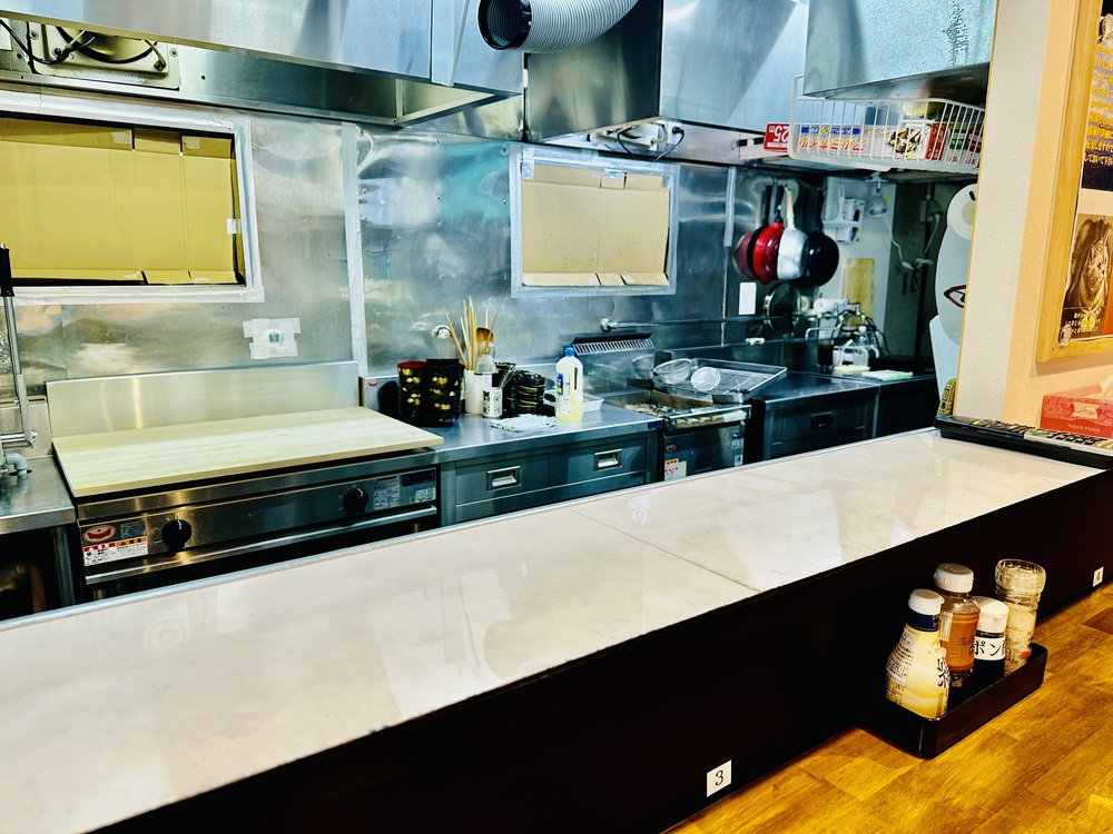カウンター越しには、きれいに磨かれた調理場が見え、新鮮なお料理がいただける期待感が膨らみます。