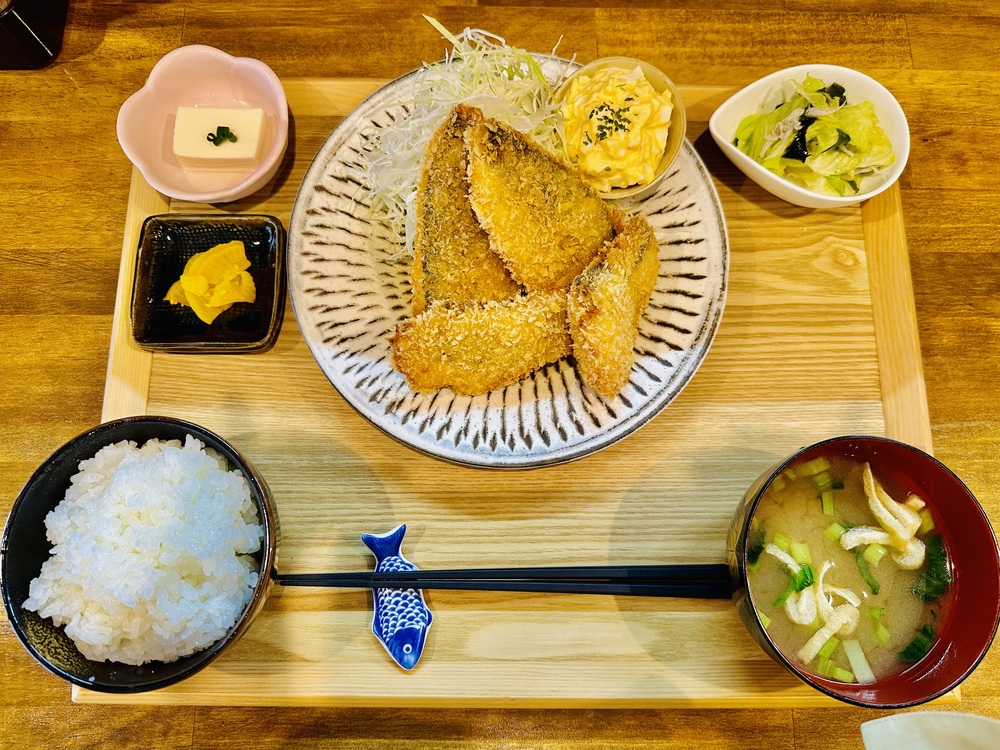 見るからにカラっと揚がった“おさかな食堂けんじ”の定食がテーブルに。