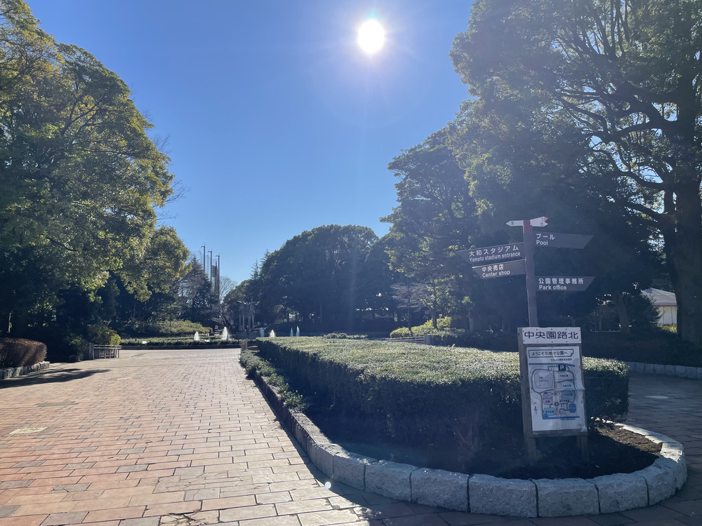 公園の近くまで行くと、大和スタジアムと温水プールが外からでも見えるため、目印にしやすいです。