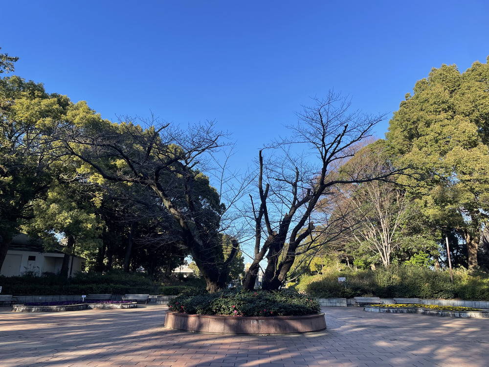 広場の中央には花壇が設けられ、その中に桜の木が植えられています。