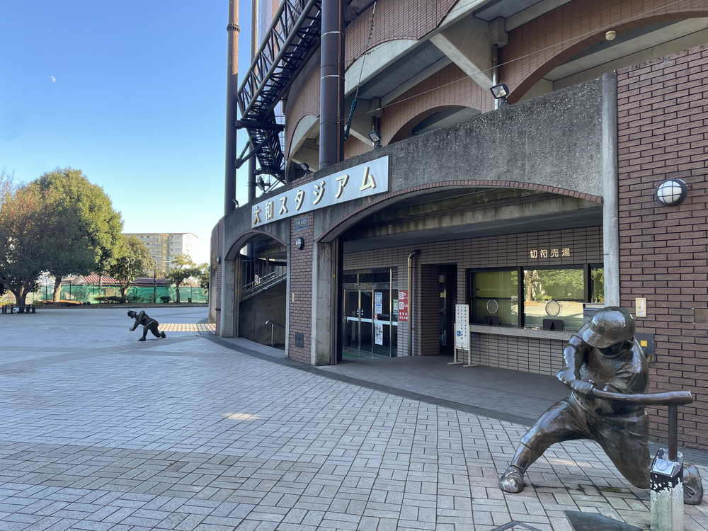 大和スタジアムは、夏の高校野球予選でも使用されており、地元では別名「ドカベンスタジアム」として親しまれています。「なぜドカベンスタジアムというのだろう」と思い、スタジアムへ向かうと、正面に野球選手のブロンズ像がありました。