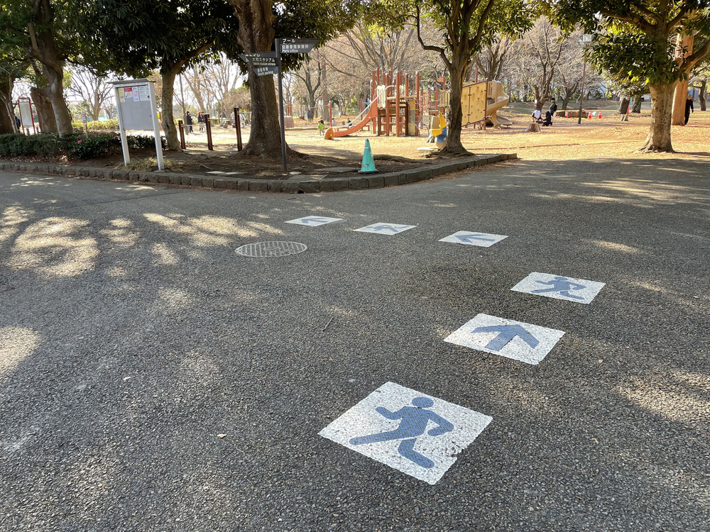 大和スタジアムの前をスタート・ゴールとする、1周1,000mの舗装されたランニングコースも整備されており、足元にマークされた矢印に沿って走ると、コースを迷わずに周ることができます。