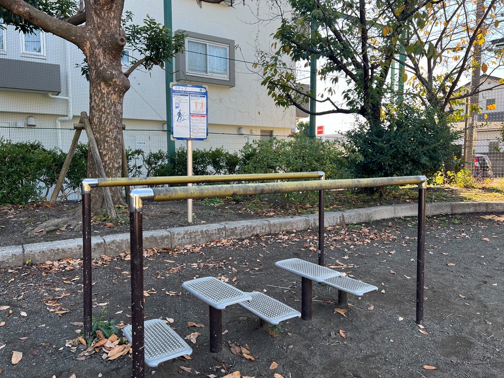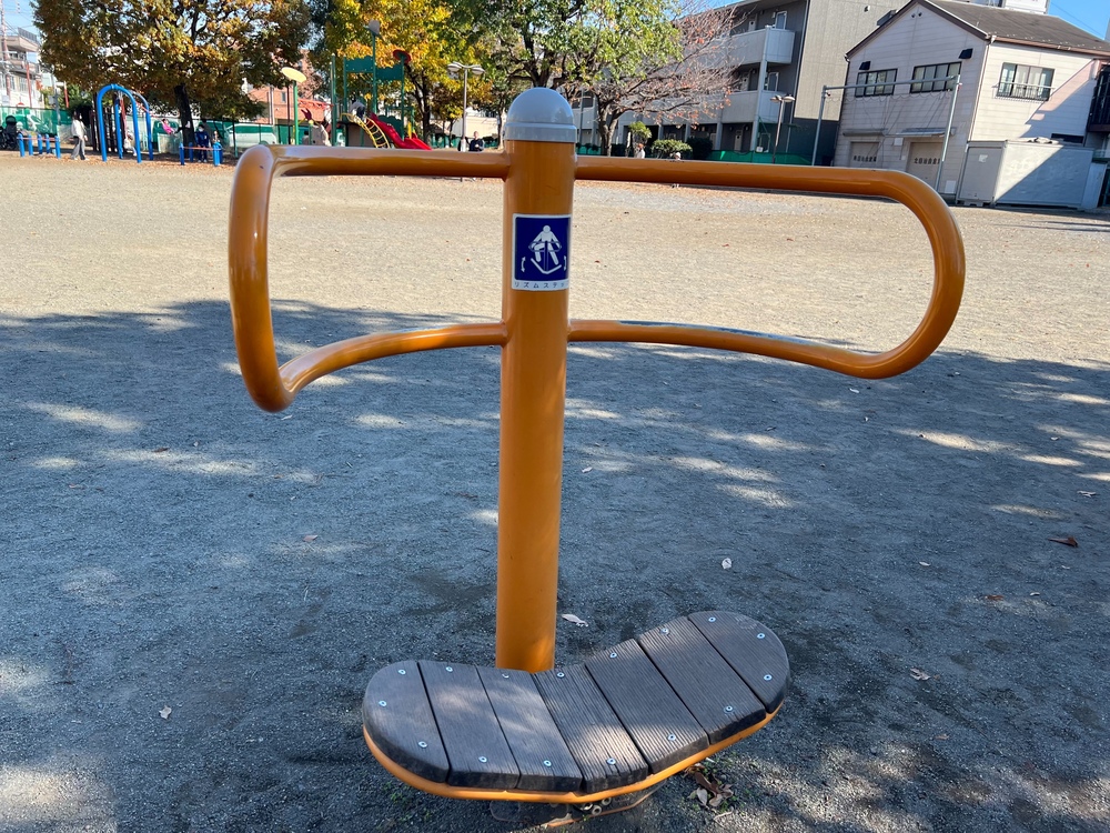 園内の一角には複数の健康器具が設置されており、大人がゆっくりと体を伸ばしたり足を動かしたりしながら、無理のないペースで運動している姿が見られます。
