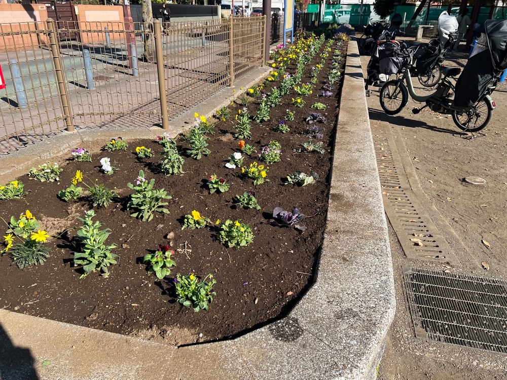 そのすぐそばには手入れの行き届いた花壇があり、季節ごとに植え替えられる花々が明るくあらわれ、公園を訪れる人の目を楽しませています。