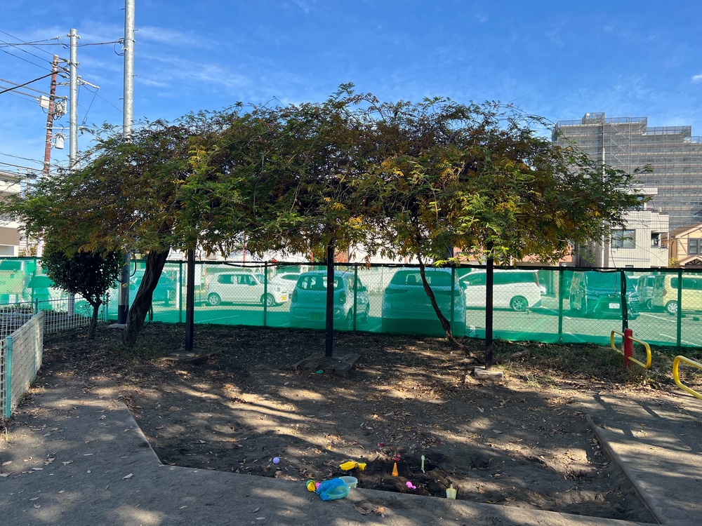 すぐ近くには砂場もあります。11月の肌寒さの中、子どもは砂場にしゃがみ込み、冷たい砂をすくって山をつくったり道をならしたりと夢中で遊んでいます。