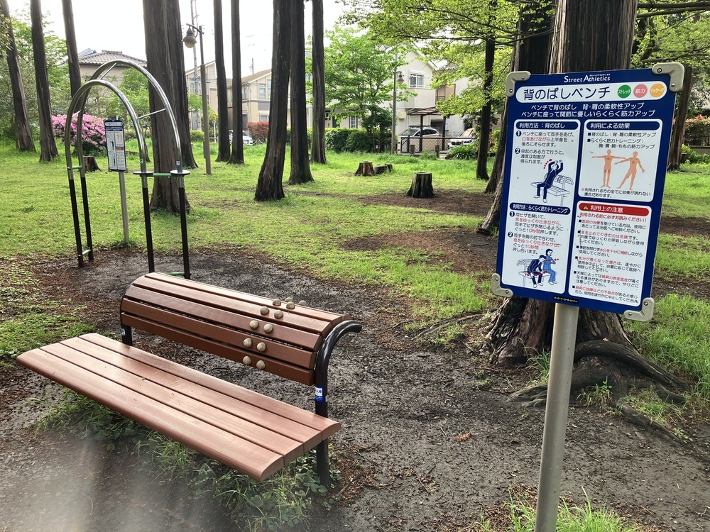 道沿いには「背伸ばしベンチ」や「腕あげアーチ」といった健康器具もあって、散歩ついでに気持ちよくストレッチができます。