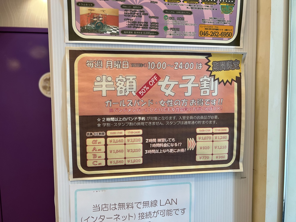 音楽スタジオアジャでは、学生さんや女性向けの割引が用意されており、部活や学校帰りでも利用しやすい点が特徴です。