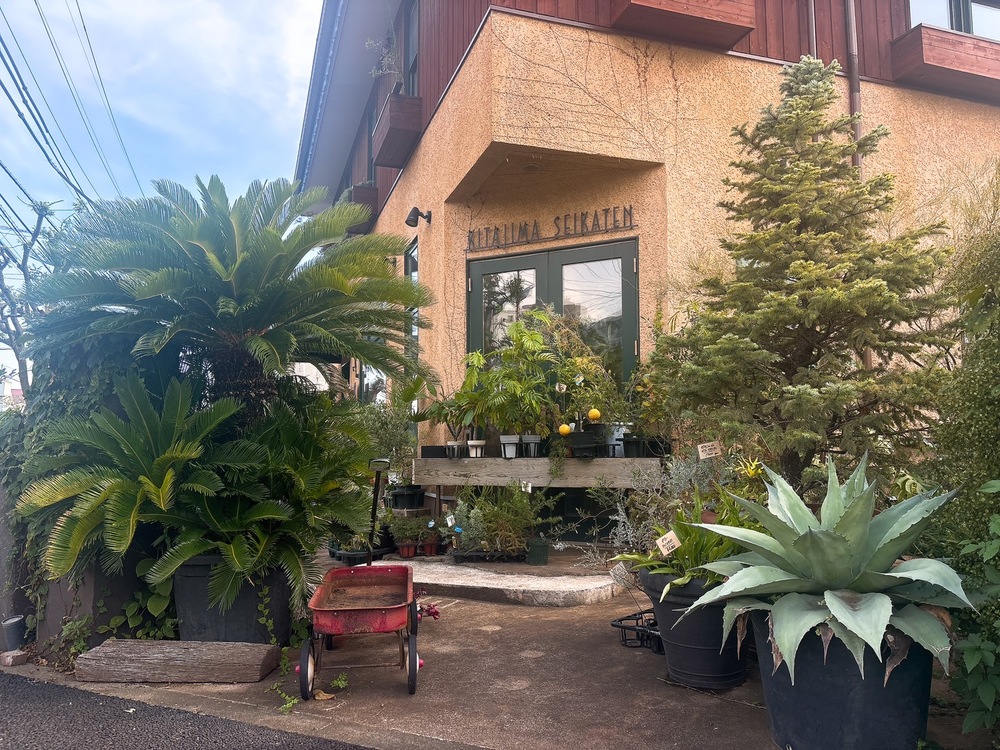 入り口のまわりには、大小さまざまなグリーンが植えられており、まるで植物たちに出迎えられるような感覚に。観葉植物や多肉植物のセレクトは、一つ一つが個性を持ち、見ているだけでも癒されます。