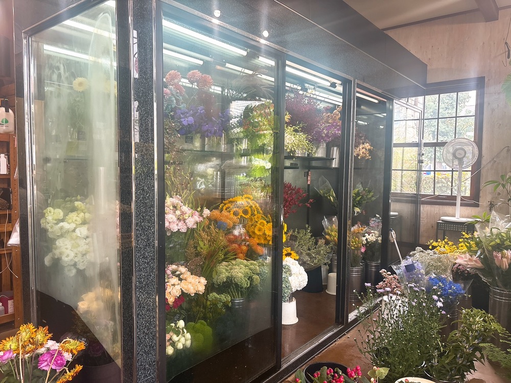 奥にはガラス張りの冷蔵ケースがあり、中には彩り豊かな切り花がたっぷり。