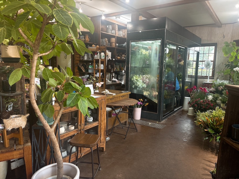 店内に一歩足を踏み入れると、外の植物の賑わいとは対照的に、落ち着いた空気が広がります。アンティーク調の木の棚やテーブルに囲まれた空間は、どこかヨーロッパのカフェを思わせるようなモダンさと温かみがあり、飾られた花や雑貨の一つ一つが引き立っています。