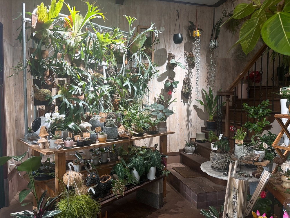 板張りの壁に吊るされた着生植物、棚に並ぶ個性豊かな鉢植えや、苔玉などが絶妙にレイアウトされていて、まるでちいさな植物園のよう。