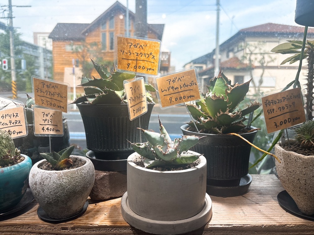 レジカウンターの向かい、大きな窓辺には、多肉植物やアガベの鉢がずらり。外から差し込む自然光のなかで、それぞれの個性がより美しく映えていました。