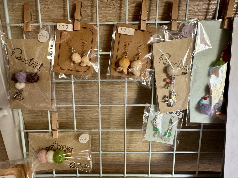 リアクタントには、ポップコーンやコーヒーのほかにも、心をくすぐる雑貨が並んでいます。ポップコーンを使った小さなアクセサリーや手作りのリースなど、どれも素朴で温かい手ざわり。
