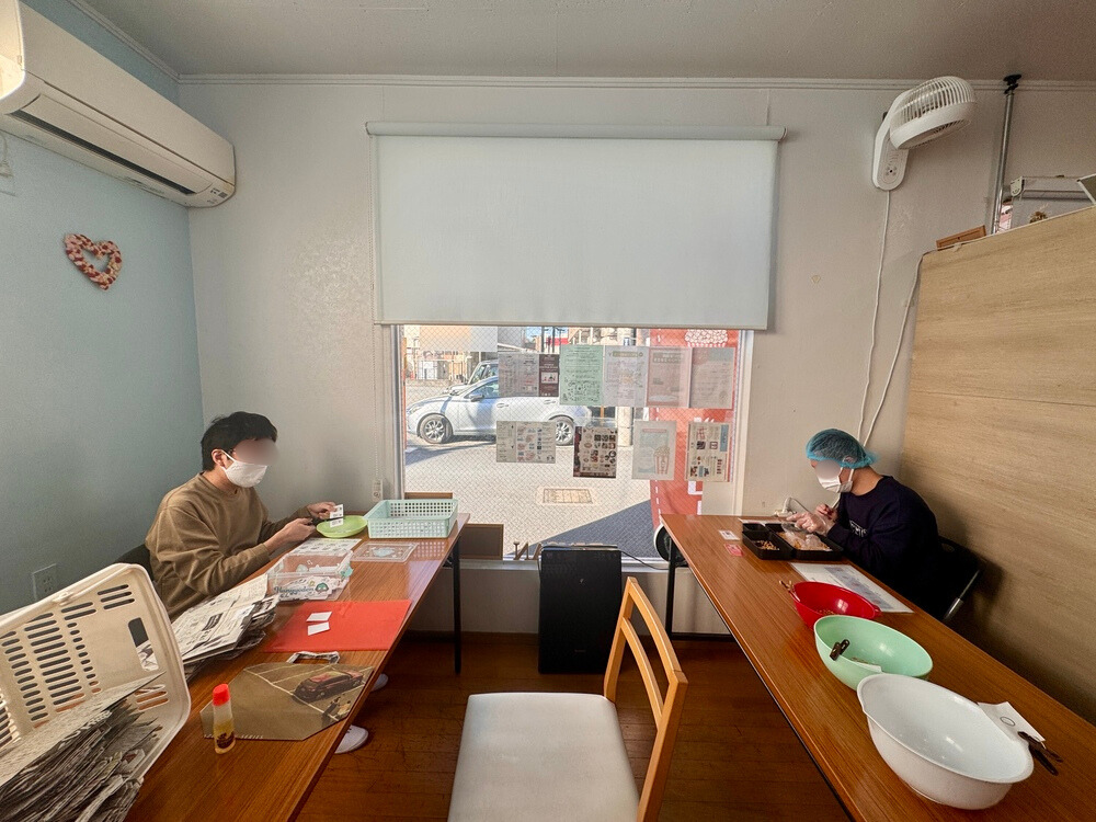 集中すると作業に没頭しがちな方へ「休むのもお仕事ですよ」とお互いに声を掛け合いながら、スタッフも利用者さんも無理のないペースで作業しています。
