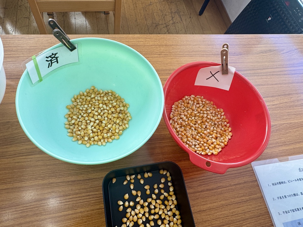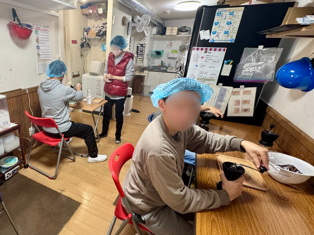 店内ではコーンの粒を選り分けたり、コーヒー豆を手挽きしたり、新聞紙バッグを作ったりと、さまざまな作業が進んでいます。