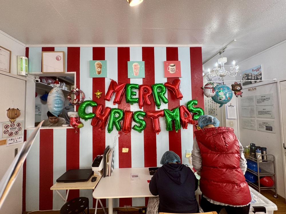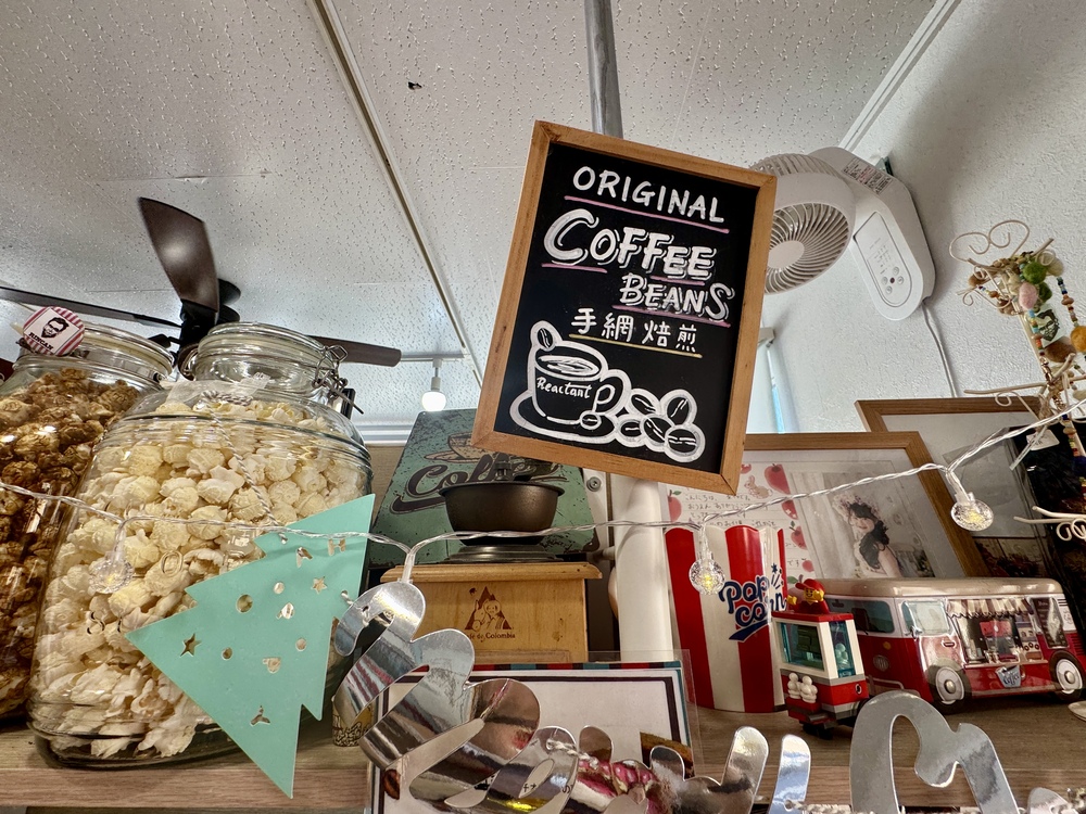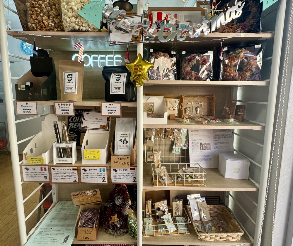 店先には赤いパッケージのポップコーンがずらりと並び、クリスマスの飾りとも相まって、あたたかい雰囲気を生み出しています。もう片側の棚にはコーヒーや雑貨がずらり。