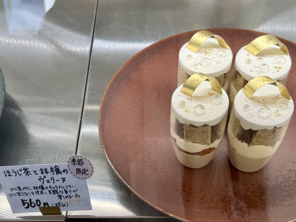 カップ仕立てのこのケーキは、ほうじ茶プリン、シフォン、キャラメル味のリンゴ、生クリームが層になり、スプーンですくうたびに味と食感が変化します。